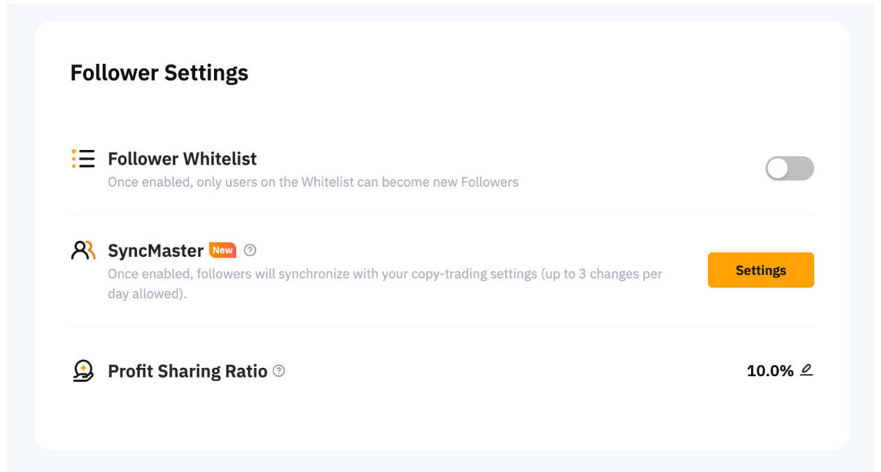En Ajustes de seguidores puedes administrar tu lista blanca de seguidores, SyncMaster y ratio de reparto de ganancias.