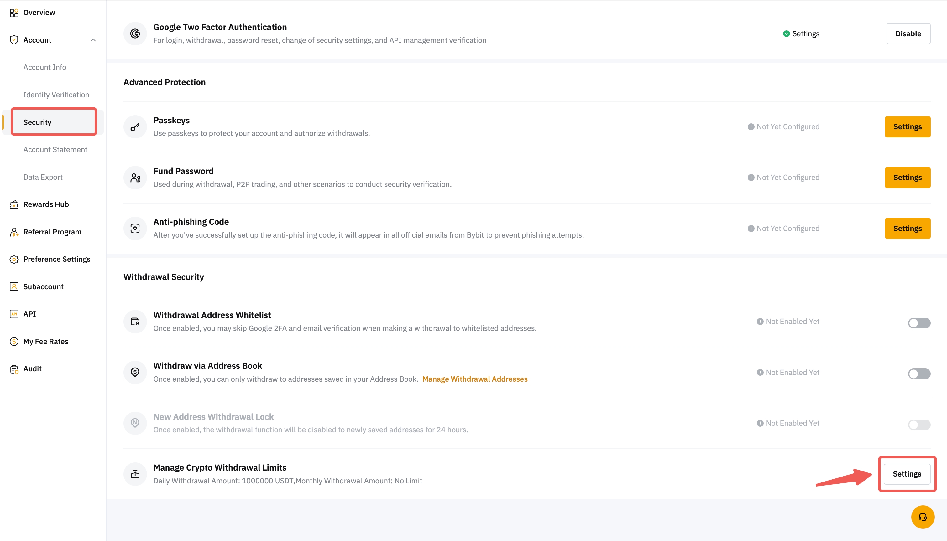 Langkah 2: Buka Keamanan Penarikan → Kelola Batas Penarikan Kripto dan klik tombol Pengaturan.