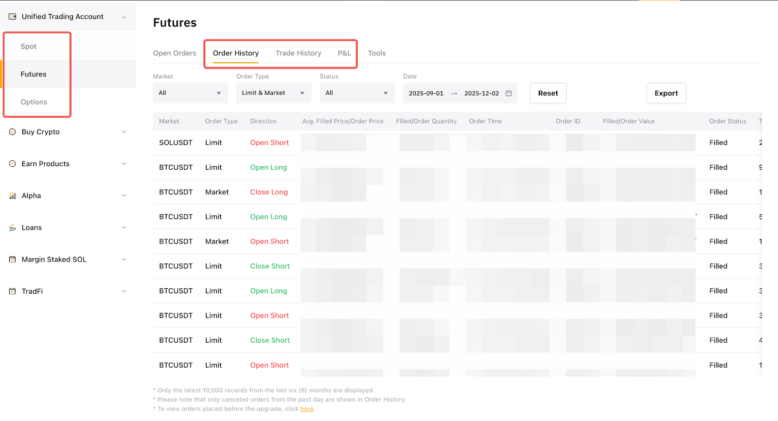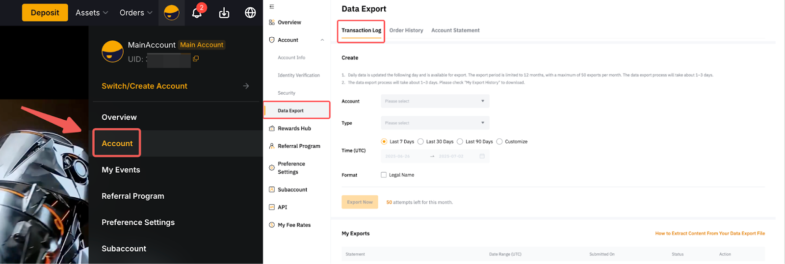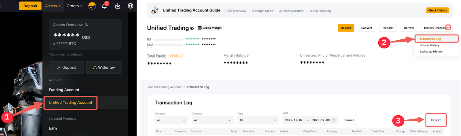 Langkah 1: Anda juga dapat mengekspor catatan transaksi melalui Akun Perdagangan Terpadu Anda. Untuk melakukannya, buka Aset → Akun Perdagangan Terpadu → Catatan Riwayat → Log Transaksi → Ekspor.