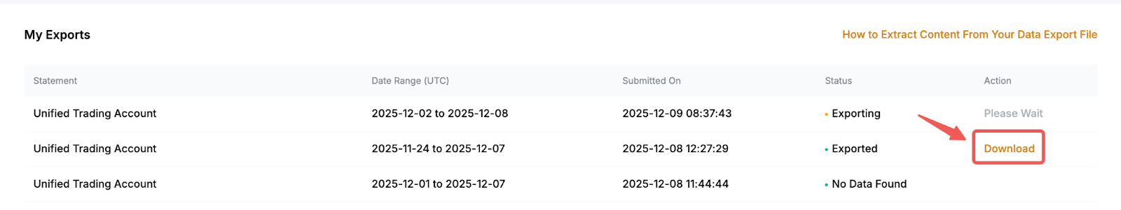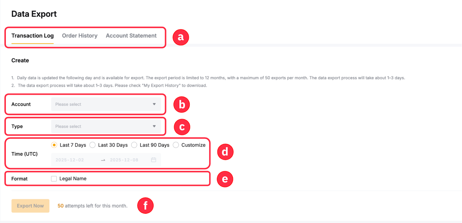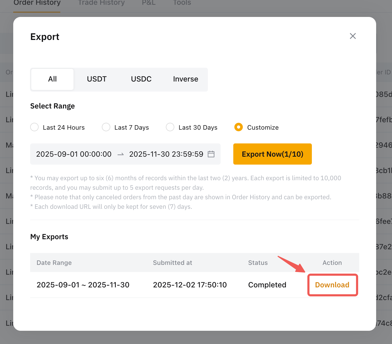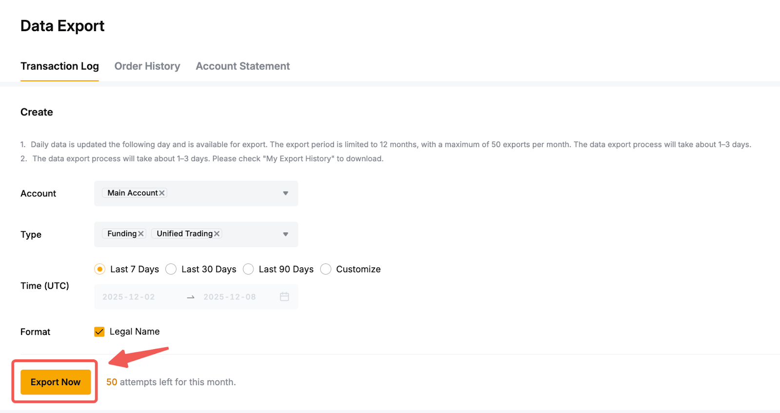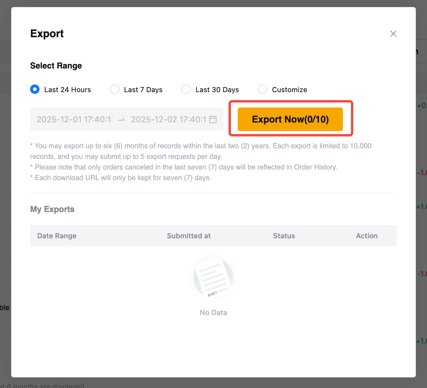 - Setiap ekspor dibatasi hingga 10.000 entri, dan Anda dapat mengajukan hingga sepuluh (10) permintaan ekspor per hari untuk Pesanan Spot dan hingga lima (5) permintaan ekspor untuk Pesanan Derivatif.