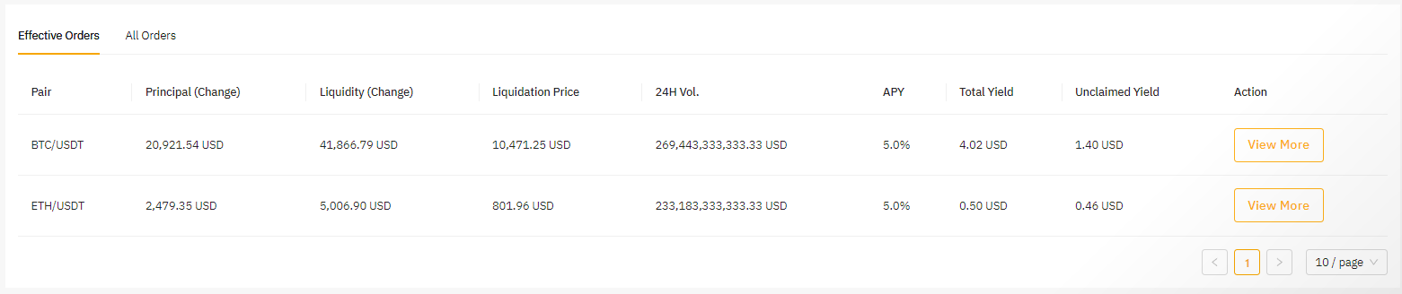 有効な注文:ペア、元本(変動)、流動性(変動)、強制決済価格、年間利回り、合計利回り、受取可能な利回りなど、アクティブ注文の詳細をご確認いただけます。