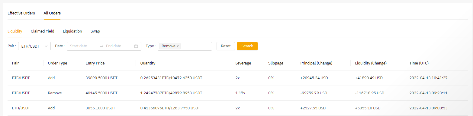 すべての注文:流動性、受取済み済み収益、強制決済、スワップ、ペア、日付、タイプなど、全注文の詳細をご確認いただけます。