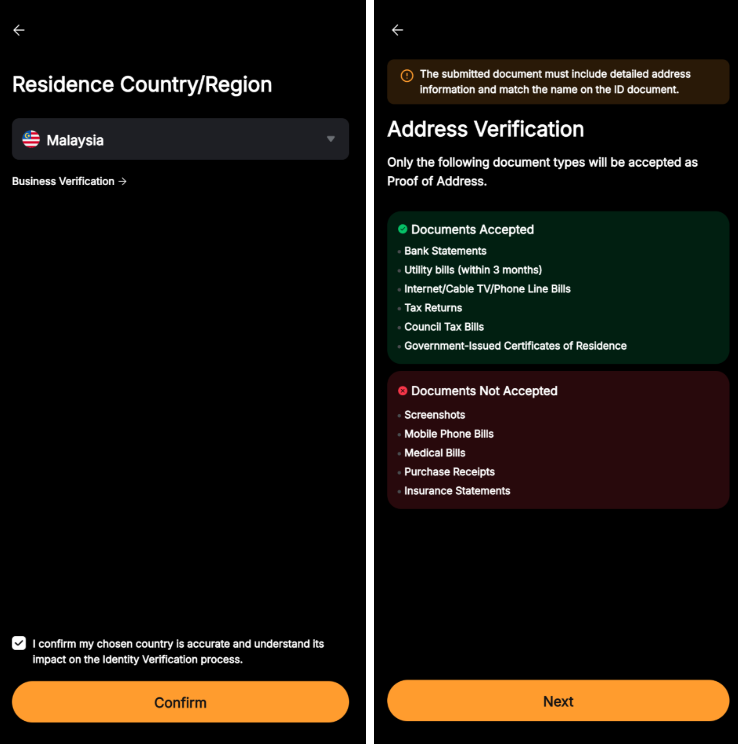 ステップ2: 現在の居住国を選択してください。お客様の認証プロセスに影響を与える可能性があるため、正確な居住国と地域を選択してください。確認後に変更を行う場合、追加の認証が必要になる場合があります。