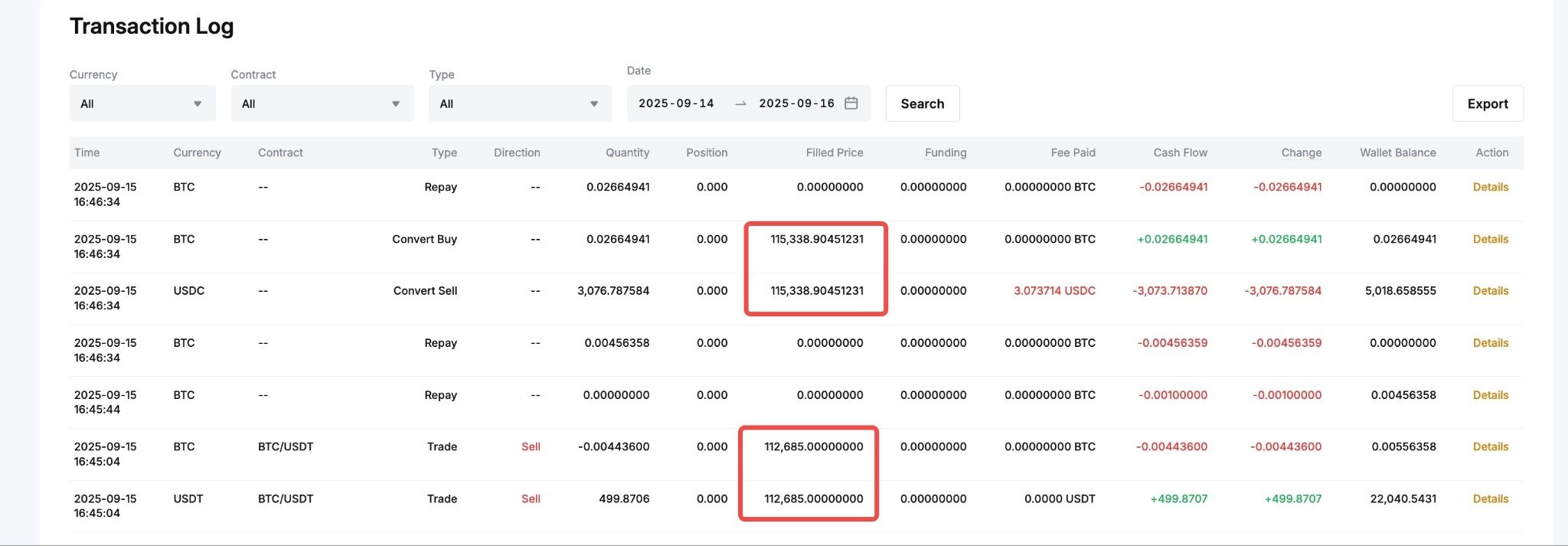 When you perform any crypto-to-crypto conversion for repayment — for example, swapping USDC to BTC — you will see two transaction records. These two records will show the same filled price.