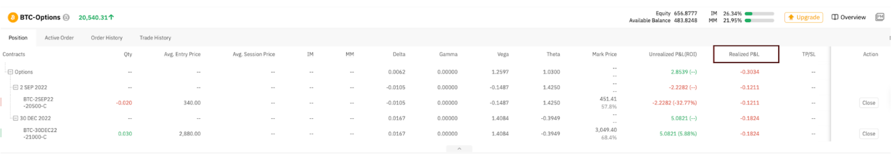 Bob sells a 0.3 of BTC BTCUSDT-31DEC21-50000-C with an average entry price of $2,600. The price of BTC rises, and when the mark price reaches $2,800, the unrealized P&L of the option he holds is [(2,600 − 2,800) × 0.3] = −60 USDT.