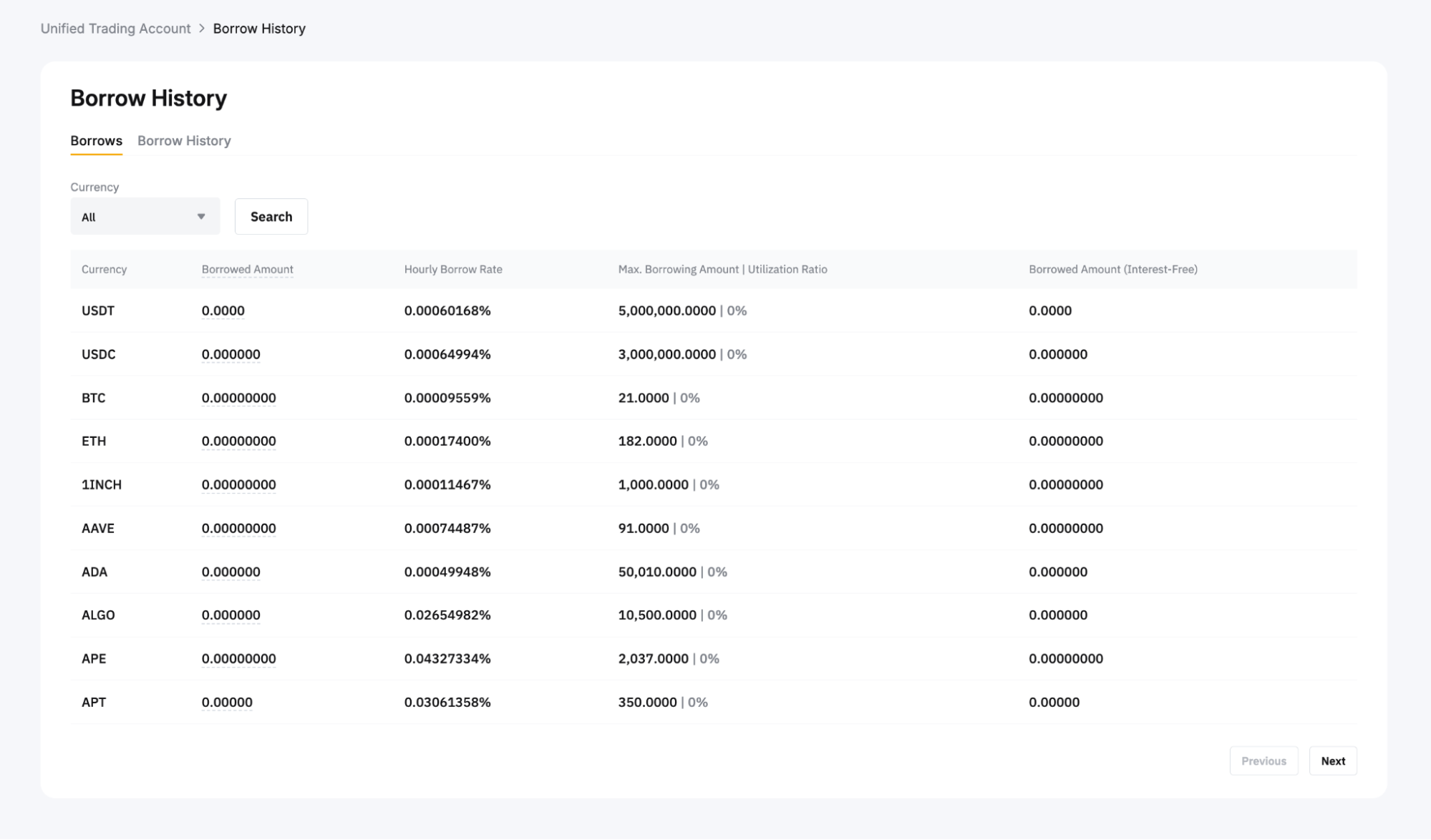• Valor máximo de empréstimo: O limite máximo de empréstimo para cada moeda. Este limite é compartilhado entre sua Conta principal e as Subcontas.