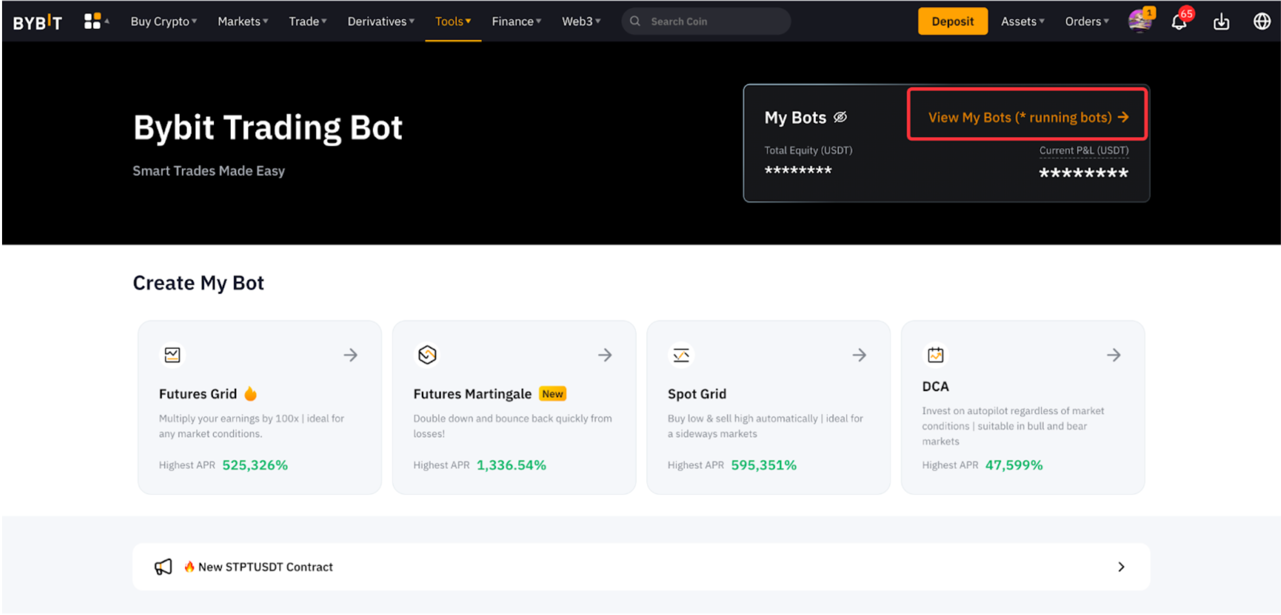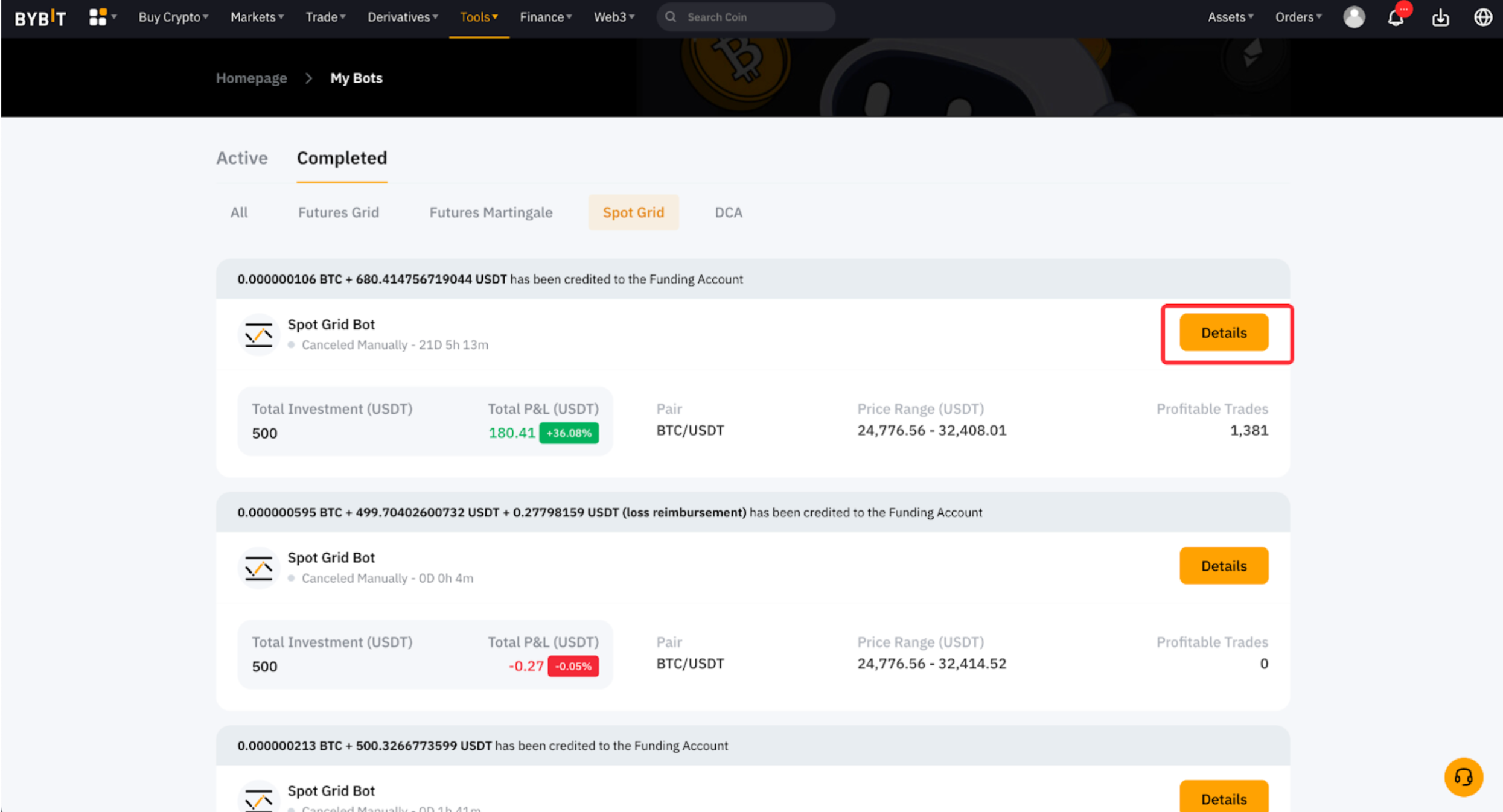 No site da Bybit, acesse Meus Robôs para ver todos os bots ativos e concluídos. Clique em Detalhes do bot específico para acessar suas informações detalhadas.