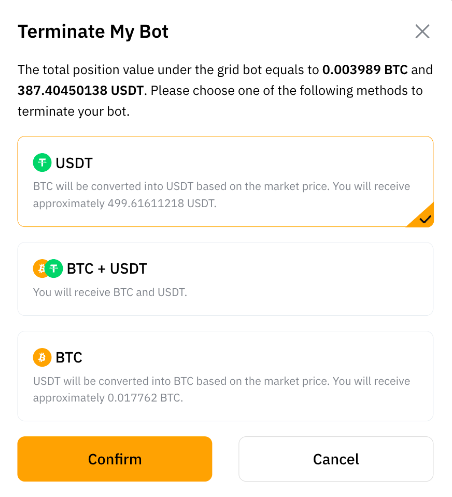Se você escolher BTC+USDT, o valor recebido em ativos será igual ao lucro total. Se você escolher USDT ou BTC, a conversão entre tokens será baseada no preço de mercado e será cobrada a corretagem Spot correspondente. Por isso, você poderá receber menos do que o lucro total exibido na área de Lucro da página de Detalhes.