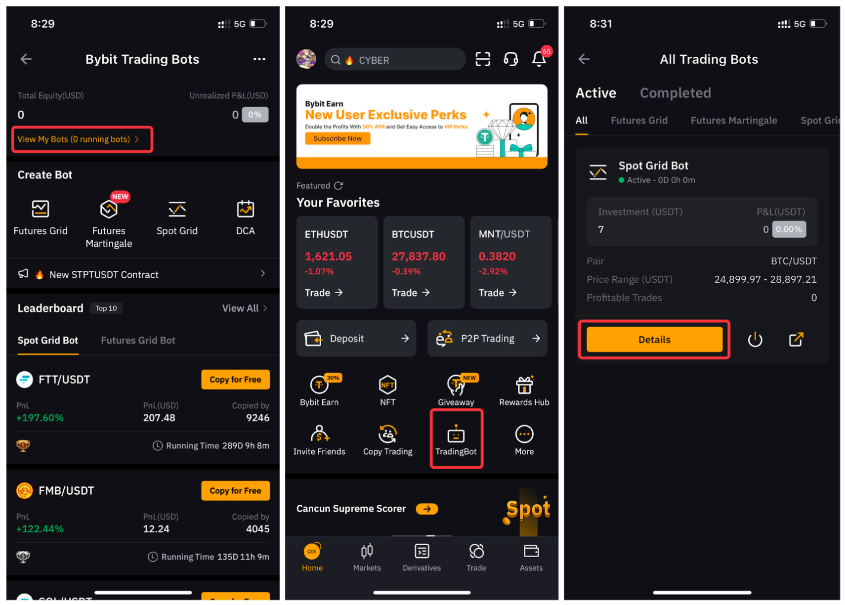 No aplicativo Bybit, vá para Trading Bots → Ver meus bots → Detalhes para ver os detalhes do seu bot.