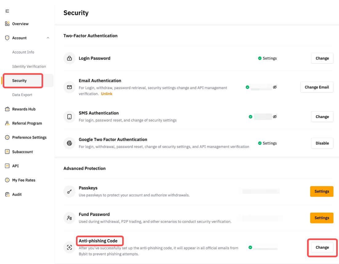 To modify your current Anti-phishing Code on Bybit, tap on Security and click on the Change button under the Anti-phishing Code configuration.