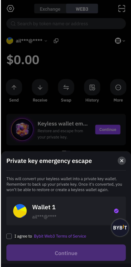 Um recurso de fuga de emergência com chave privada foi lançado para ajudar os usuários com os ativos restantes em suas MPC (Carteiras sem chave), mesmo após essas carteiras terem sido descontinuadas na Wallet. Observe que isso não é compatível com Cloud Wallet.