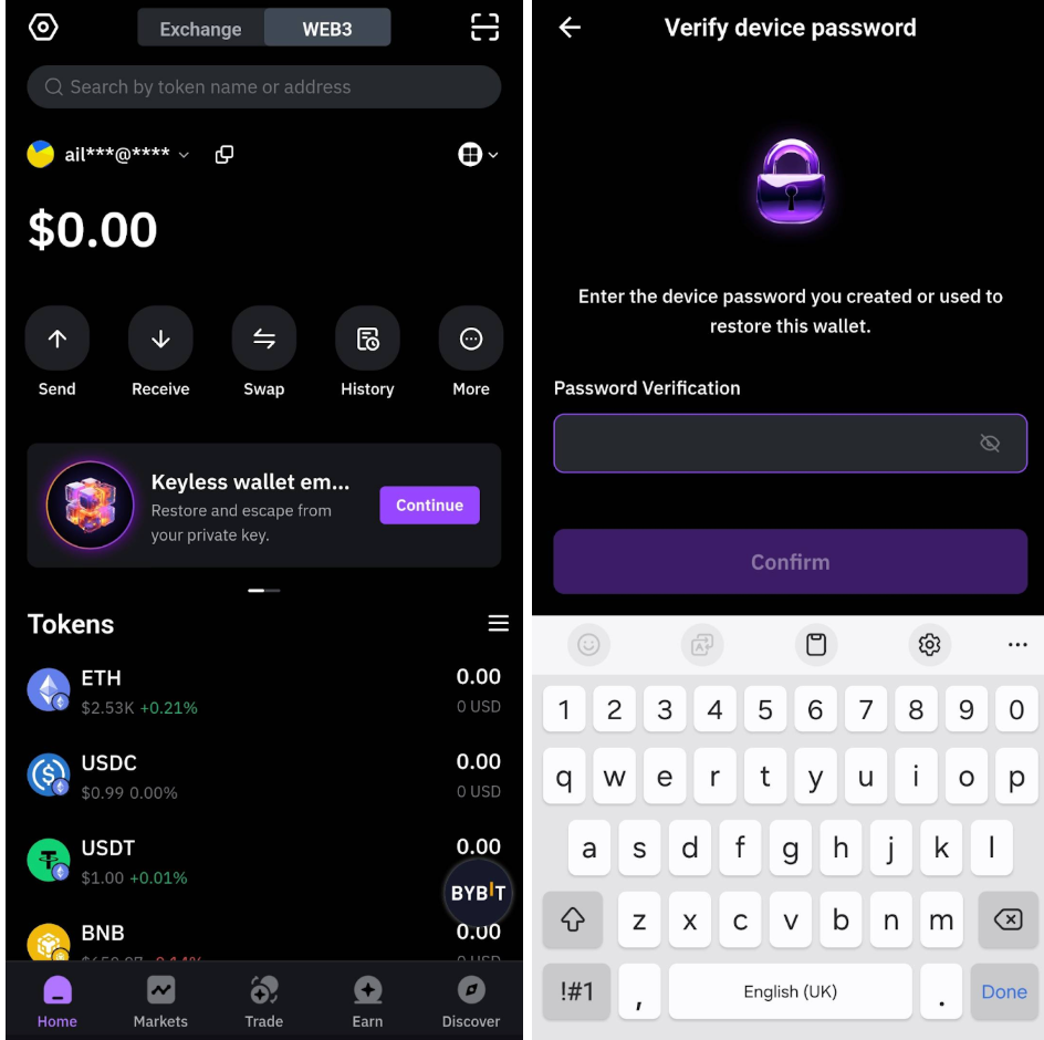 Faça login no App MPC (Keyless Wallet), verá um banner na Wallet. Toque em Continuar no banner Fuga de emergência com chave privada e verifique com a senha do seu dispositivo.
