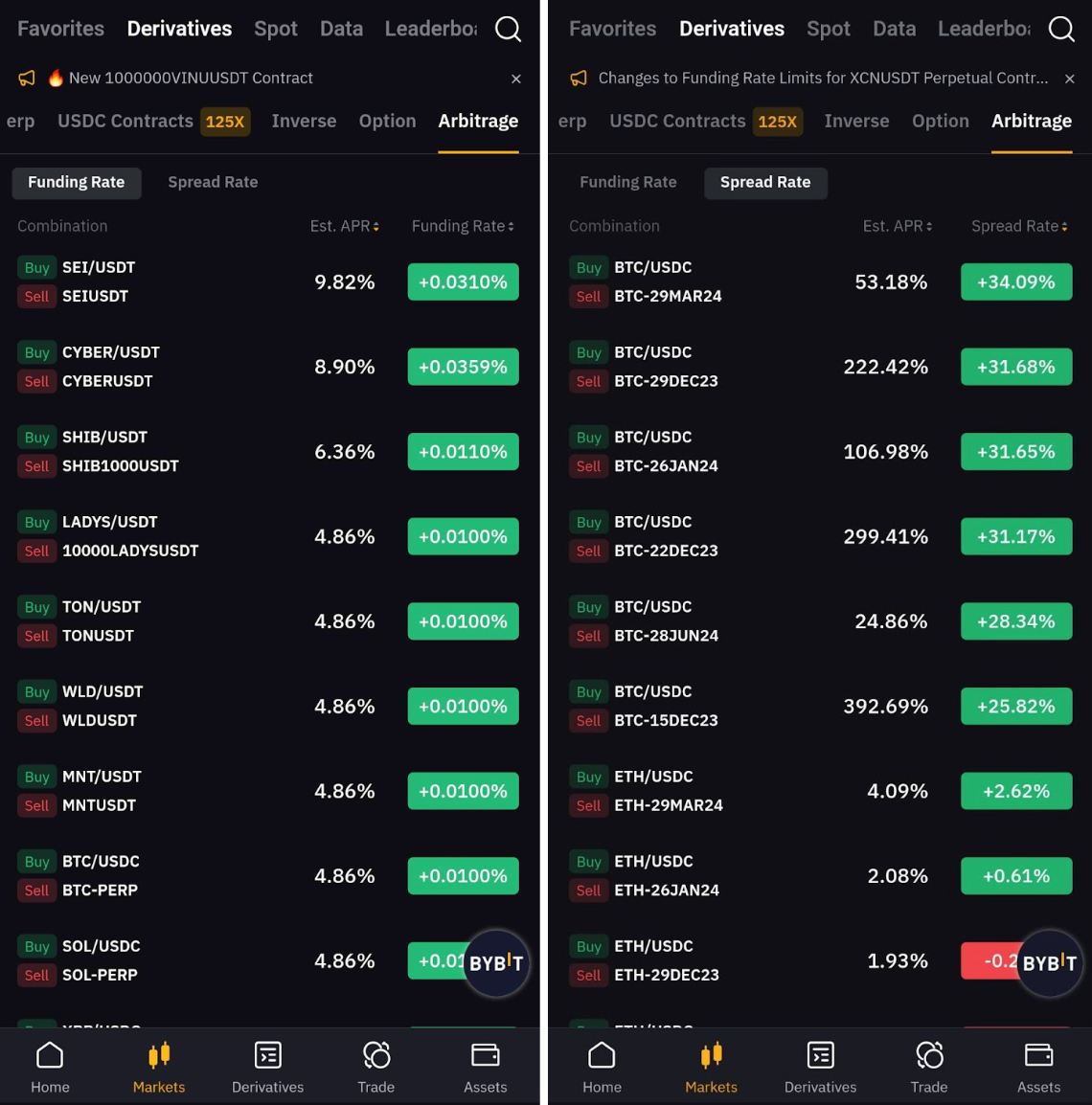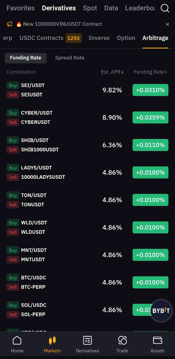 Арбитраж на Bybit может использоваться на ставках финансирования и спредах.