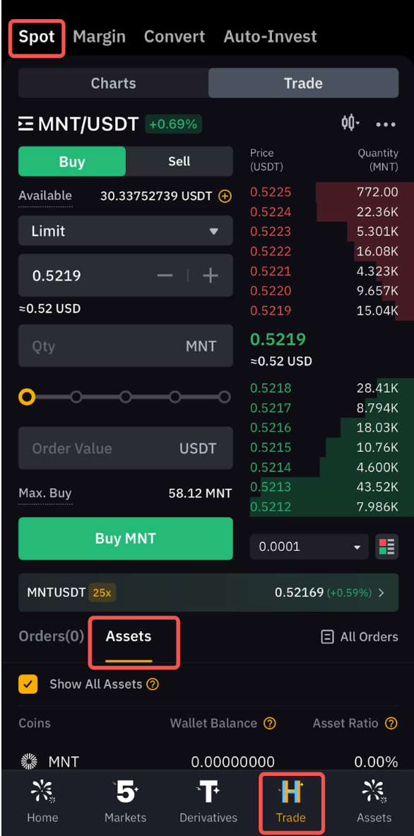Для просмотра спотовых активов можно перейти на вкладку «Спот» → «Активы».