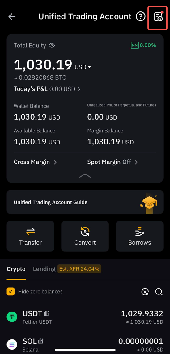 Чтобы просмотреть позиции по бессрочным и фьючерсным контрактам, нажмите «Позиции» на странице торговли деривативами. Чтобы просмотреть активы на споте, перейдите к списку активов в разделе торговли на споте, а прибыль, полученную на комиссии за финансирование, можно просмотреть в журнале транзакций.