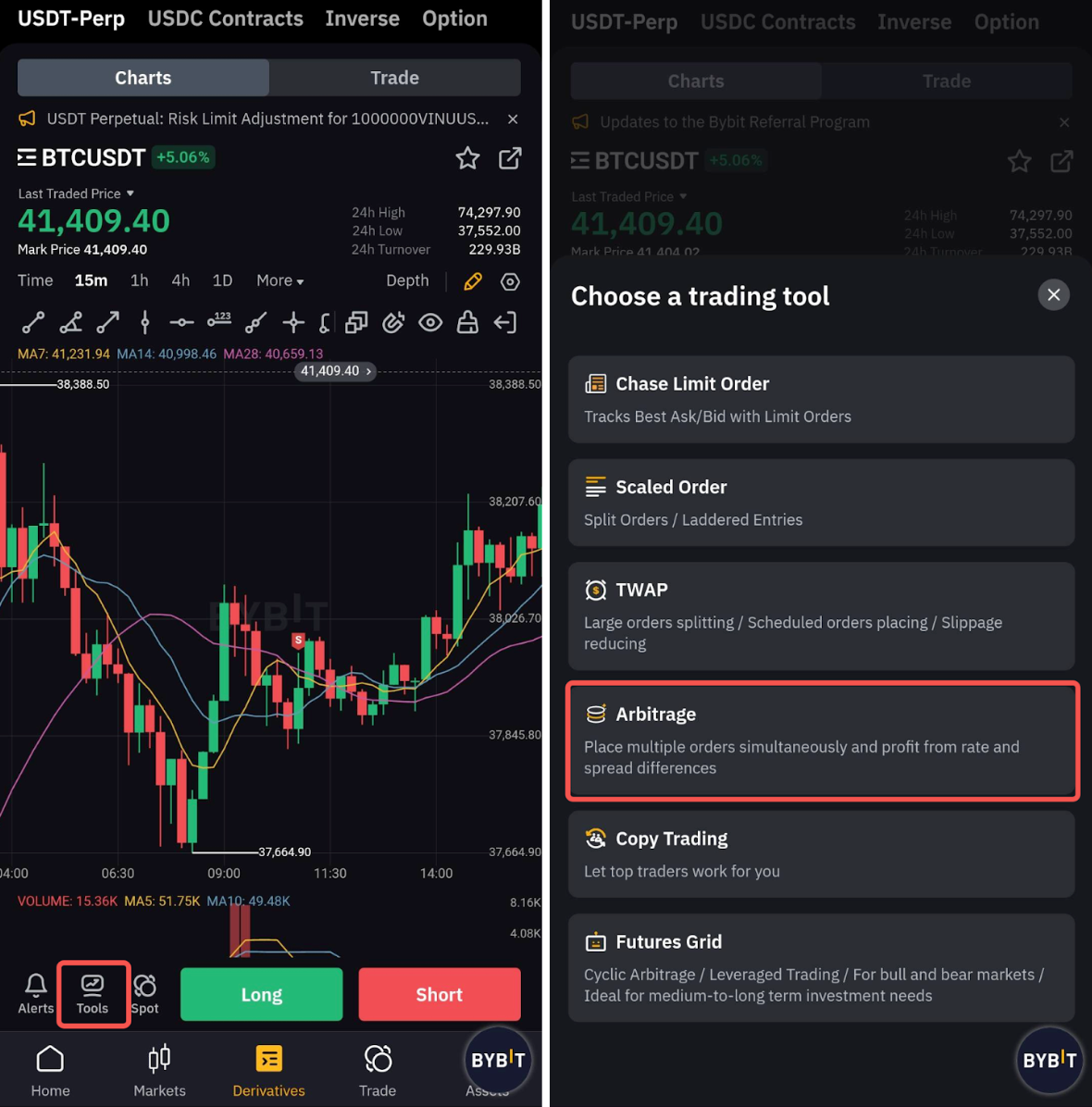 В настоящее время инструменты арбитража доступны только в приложении Bybit, эксклюзивно для пользователей с ЕТА в режиме кросс-маржи. Чтобы перейти на ЕТА, ознакомьтесь с этой статьёй.
