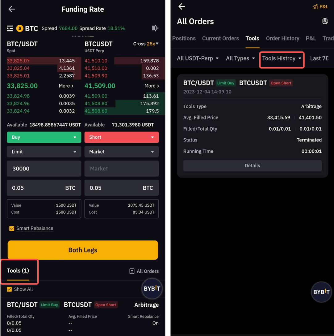 Шаг 5. Просмотрите активные арбитражные ордера в разделе «Инструменты» → «Активные». Когда ордер будет исполнен, перейдите в «Инструменты» → «История», чтобы просмотреть историю ордеров.