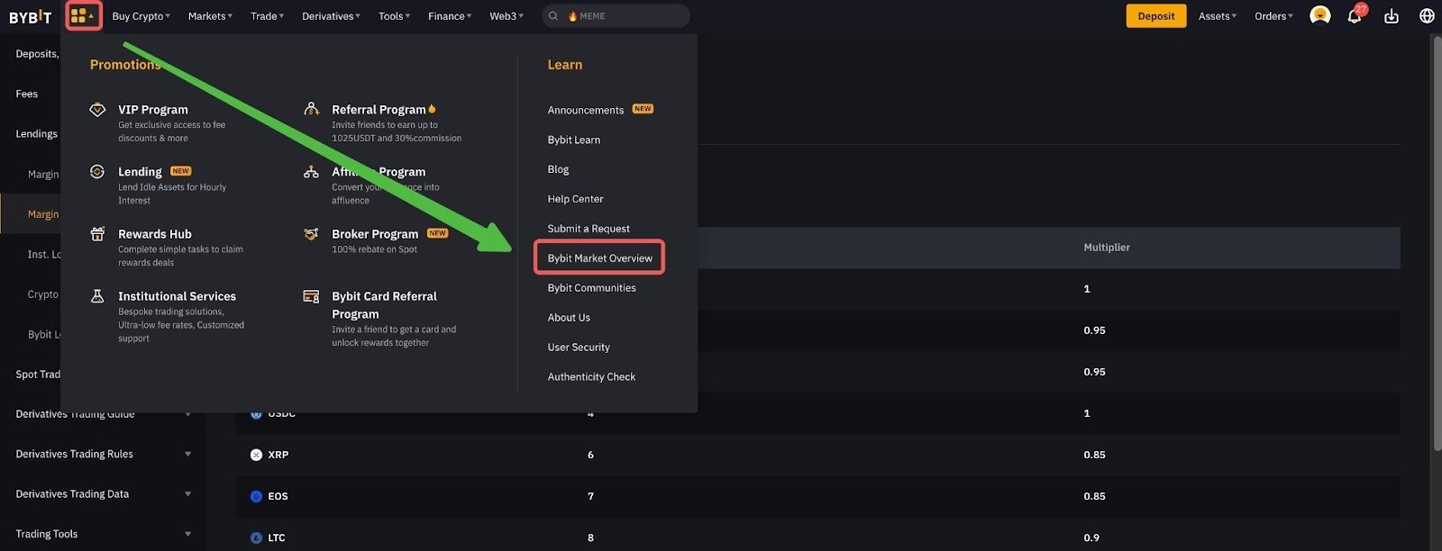 Для просмотра коэффициента стоимости обеспечения по каждой монете в рамках Единого торгового счета перейдите к значку "Приложение" в левом верхнем углу и выберите пункт "Обзор рынка Bybit".