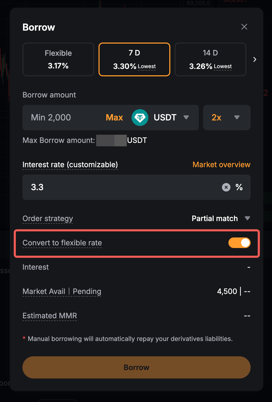 Активы можно занимать вручную на странице Маржинальной торговли на споте или на странице активов ЕТА. Поддерживаются варианты с гибким сроком и несколькими фиксированными сроками, включая 7, 14, 30, 60, 90 и 180 дней. После займа активы добавляются к балансу кошелька и отражаются как обязательство.