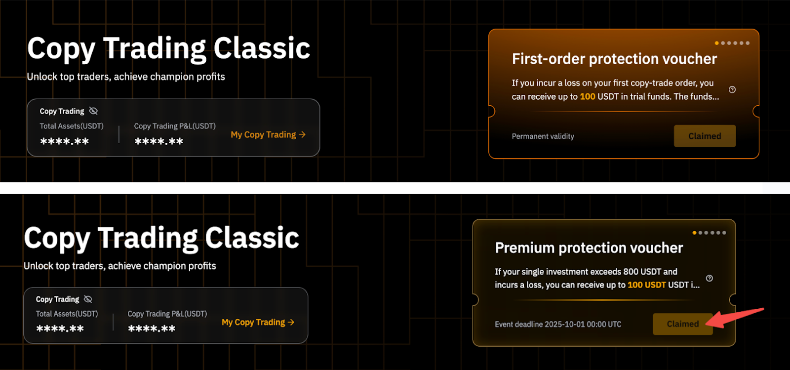 - Премиум-ваучер для защиты: Заявку на нее можно подавать раз в квартал в правом верхнем углу Копитрейдинг Classic или Копитрейдинг TradFi. В том же квартале вы имеете право на компенсацию — до 100 USDT — за убытки от одного соответствующего критериям Мастера Трейдинга. Данное преимущество может использоваться только один раз в квартал.