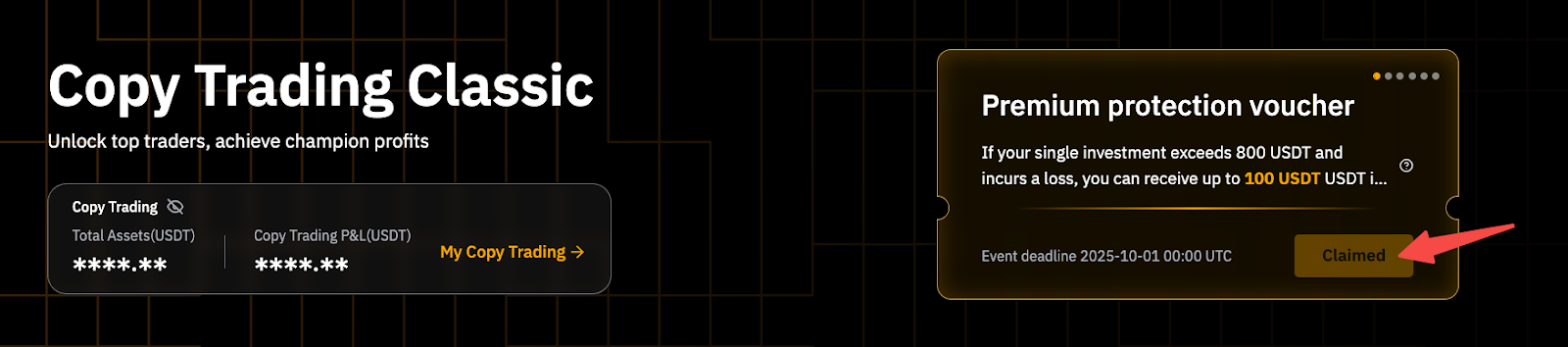 - Он предоставляет до 100 USDT в виде бонуса в Копитрейдинге в качестве компенсации убытков, понесенных по соответствующим ордерам Копитрейдинга.