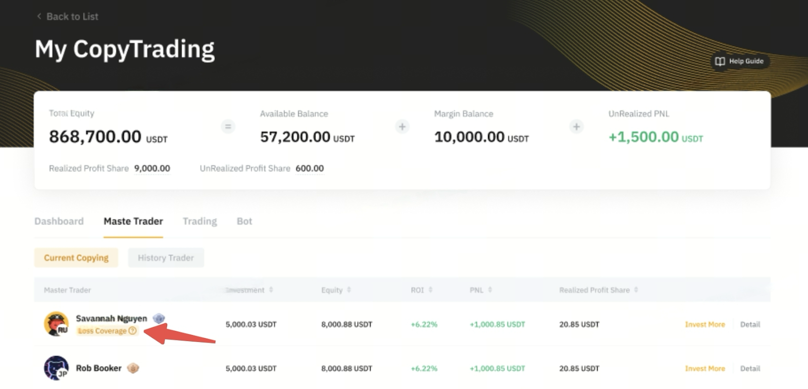 - Пример: Если первый ордер был открыт Мастером Трейдинга B, даже если Мастер Трейдинга A был скопирован первым, убытки до 100 USDT от первого ордера Мастера Трейдинга B будут компенсированы.