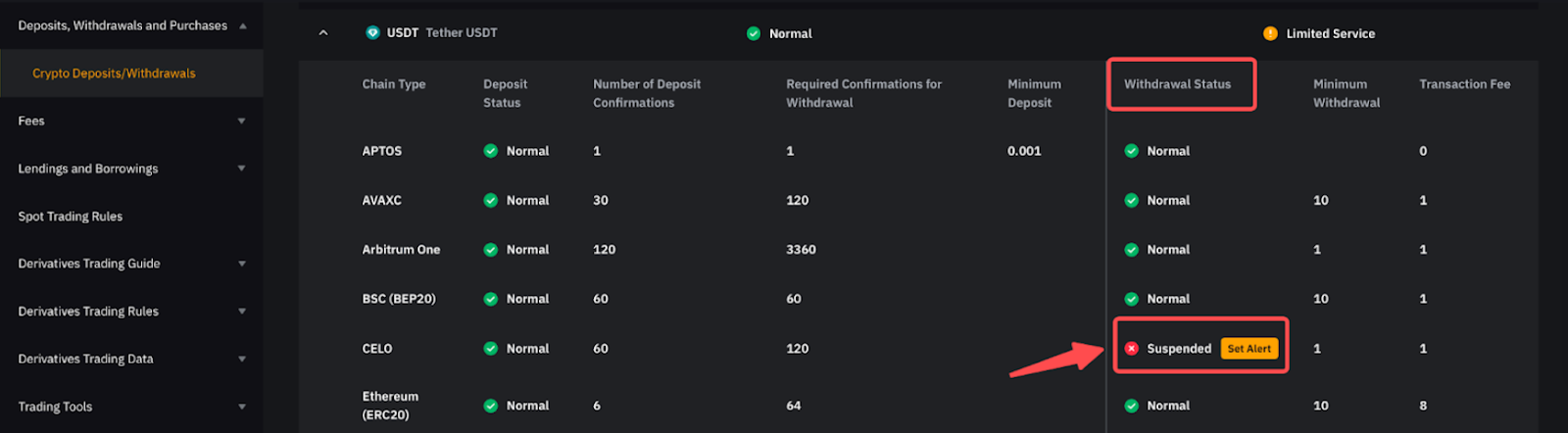 Также можно перейти на страницу статуса депозита/вывода и найти токен и сеть. Кнопка Установить оповещение будет отображаться рядом со статусом депозита Приостановлено.
