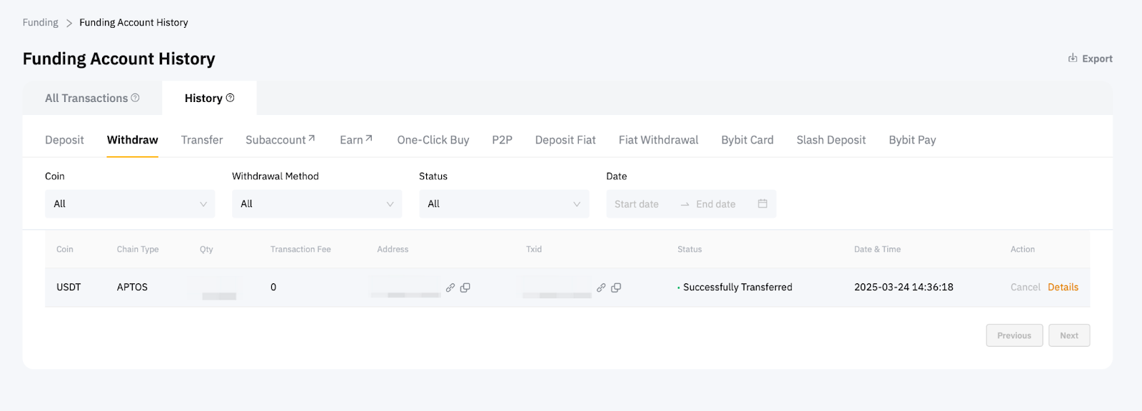 Вы можете проверить статус и детали вывода средств в разделе История аккаунта финансирования → Вывести.