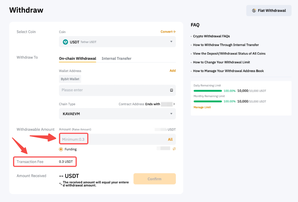 Bybit взимает фиксированную комиссию за все снятие средств и динамически регулирует комиссию майнера за пакетный перевод до более высокого уровня, чтобы обеспечить более высокую скорость подтверждения снятия средств в блокчейне.