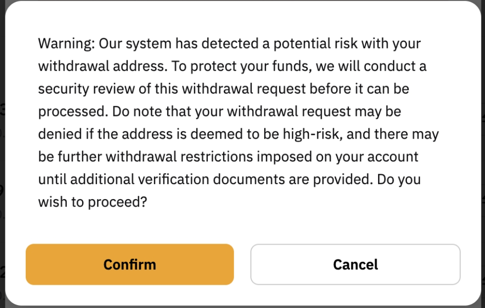 Если вы по-прежнему хотите продолжить с тем же адресом, то запрос на вывод средств может быть отклонен, если адрес считается высокорисковым. На вашу учетную запись может быть наложено ограничение по выводу средств до тех пор, пока по электронной почте не будут предоставлены дополнительные подтверждающие документы, если это необходимо.
