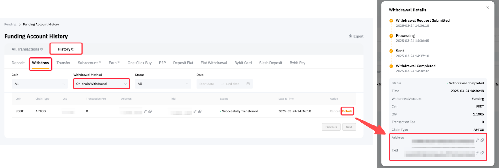 Вы можете получить TXID на странице История аккаунта финансирования → Вывести и щелкнуть детали, чтобы проверить свой адрес вывода средств и TXID.