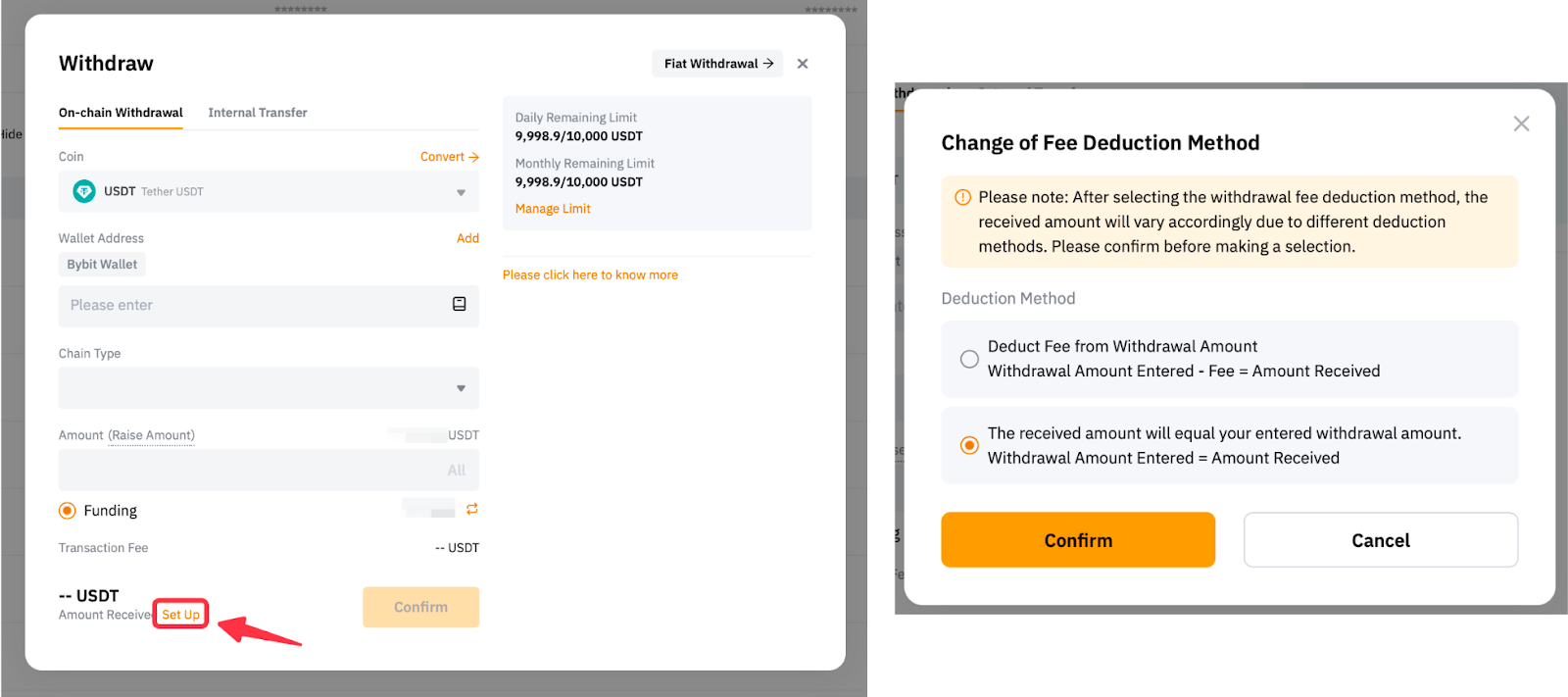 По умолчанию комиссия за вывод будет вычтена из указанной суммы вывода. Однако эту настройку можно изменить, нажав Установить и выбрав предпочтительный способ вычета.