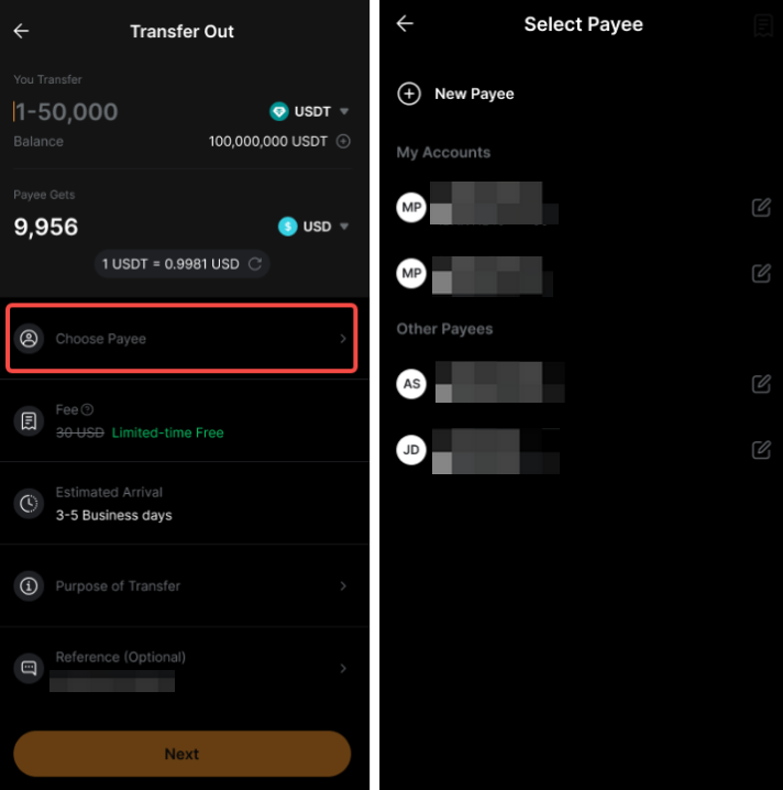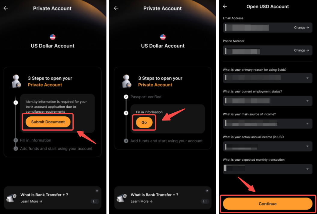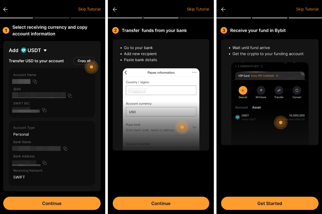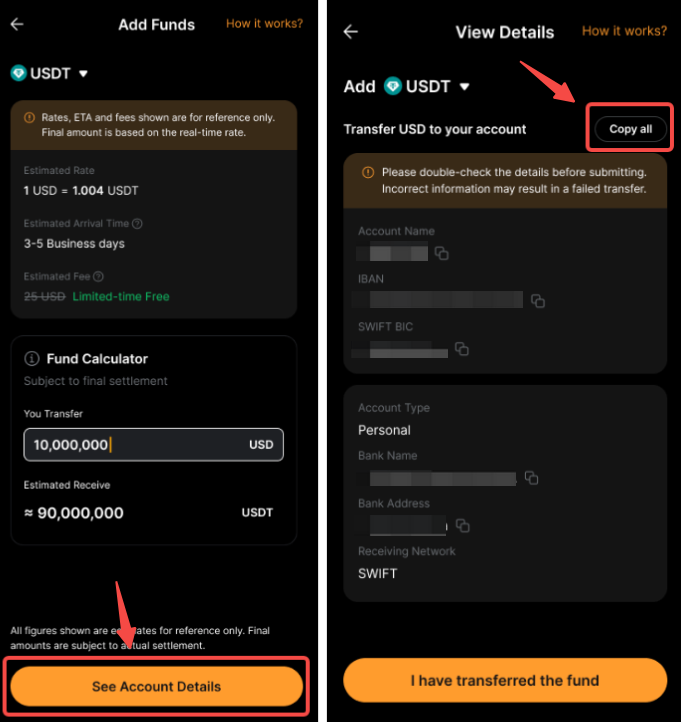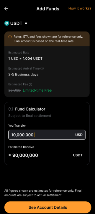После настройки банковского перевода +, вы можете переводить фиатную валюту со своего банковского счета и получать USDT или USDC на свой аккаунт финансирования.