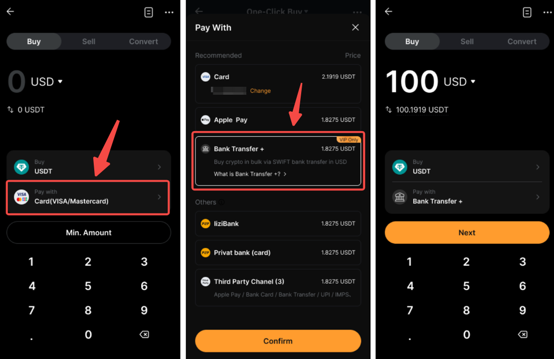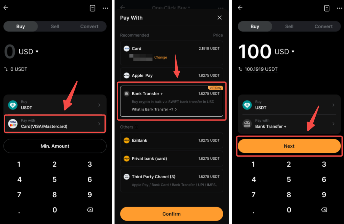 Шаг 1Перейдите на страницу Покупка криптовалюты, выберите банковский перевод + в качестве способа оплаты, нажав Оплатить через, затем нажмите Далее для продолжения.