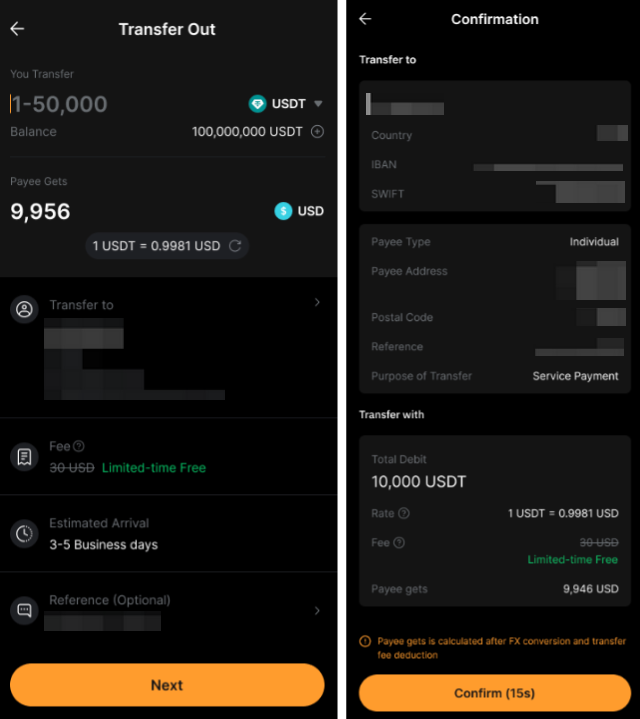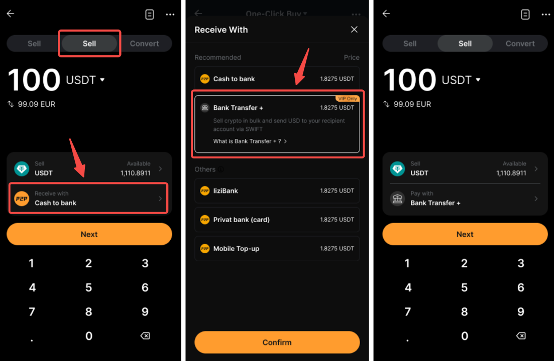 С помощью «Банковского перевода +» вы можете вывести свои USDT или USDC в виде фиата напрямую на внешний банковский счет.