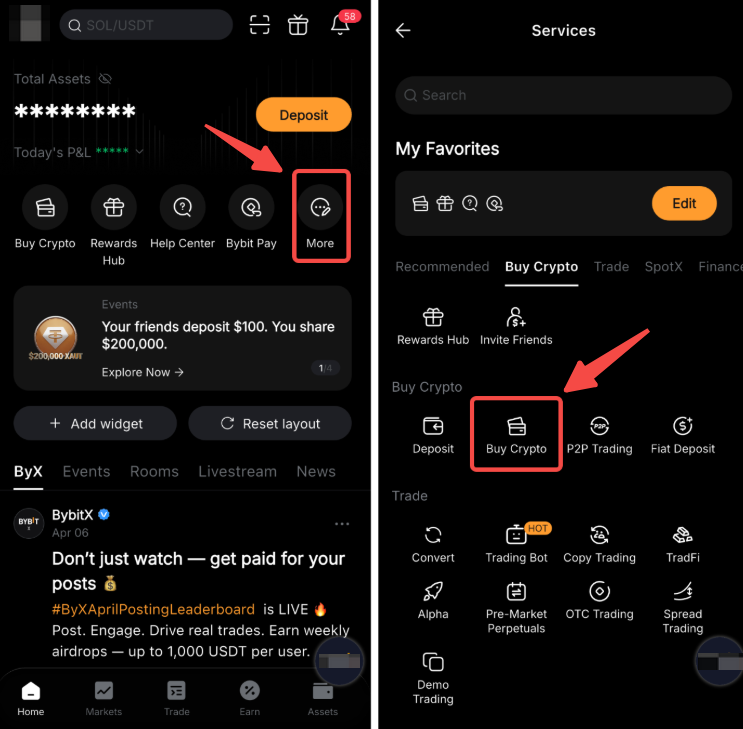 Шаг 1: На главная странице вашего приложения Bybit, нажмите Еще Купить криптовалюту.