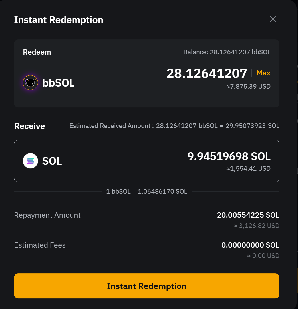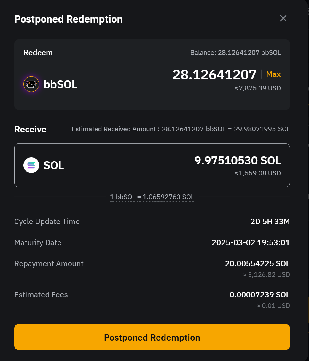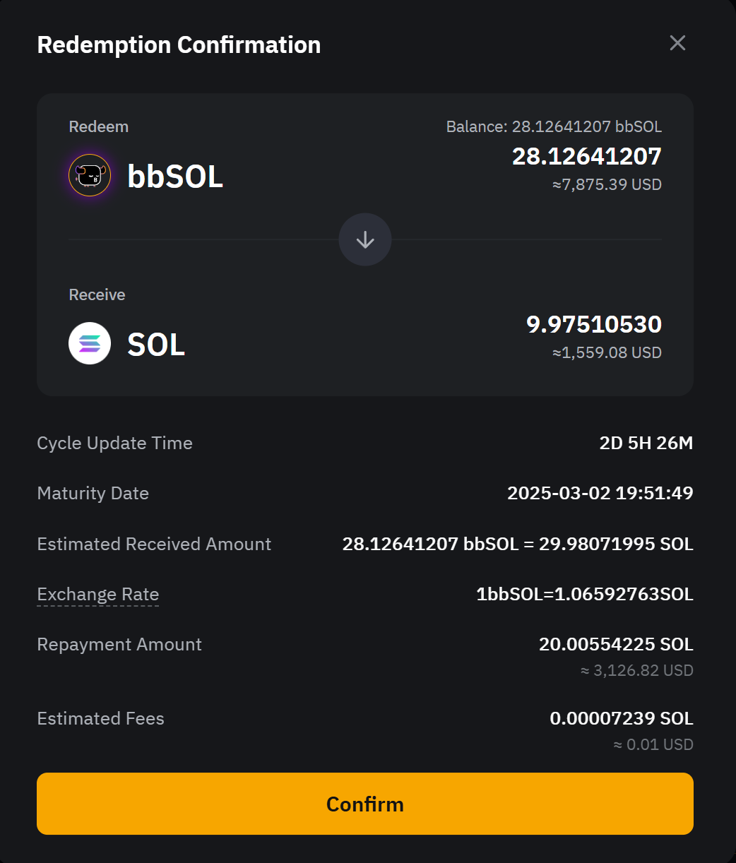 - Отложенное получение. Получите весь основной капитал и прибыль по истечении 1–4 дней периода обработки, в течение которого проценты будут продолжать начисляться. bbSOL будут конвертированы в SOL по текущему обменному курсу на момент отправки запроса на выкуп.