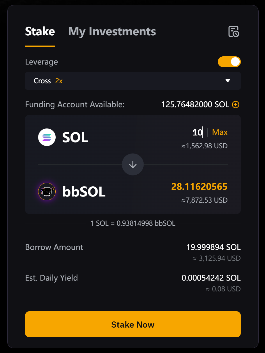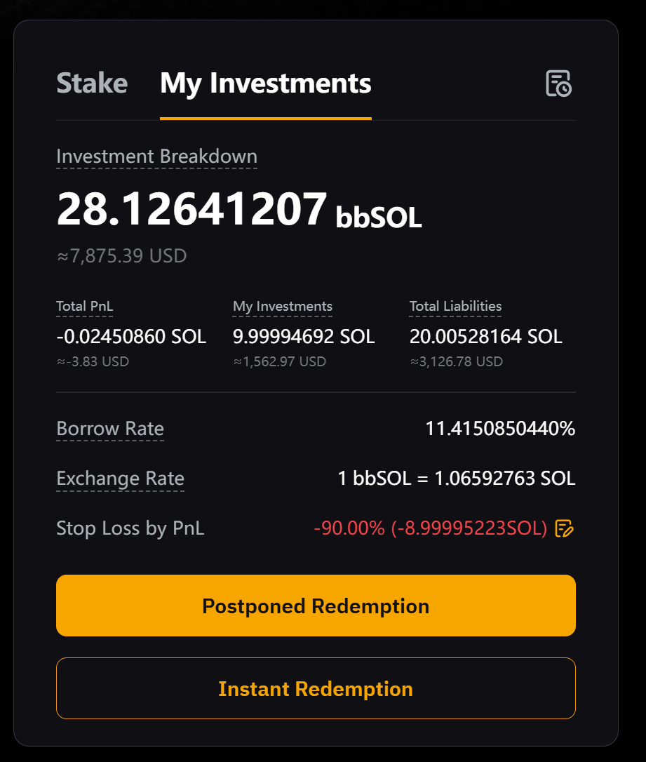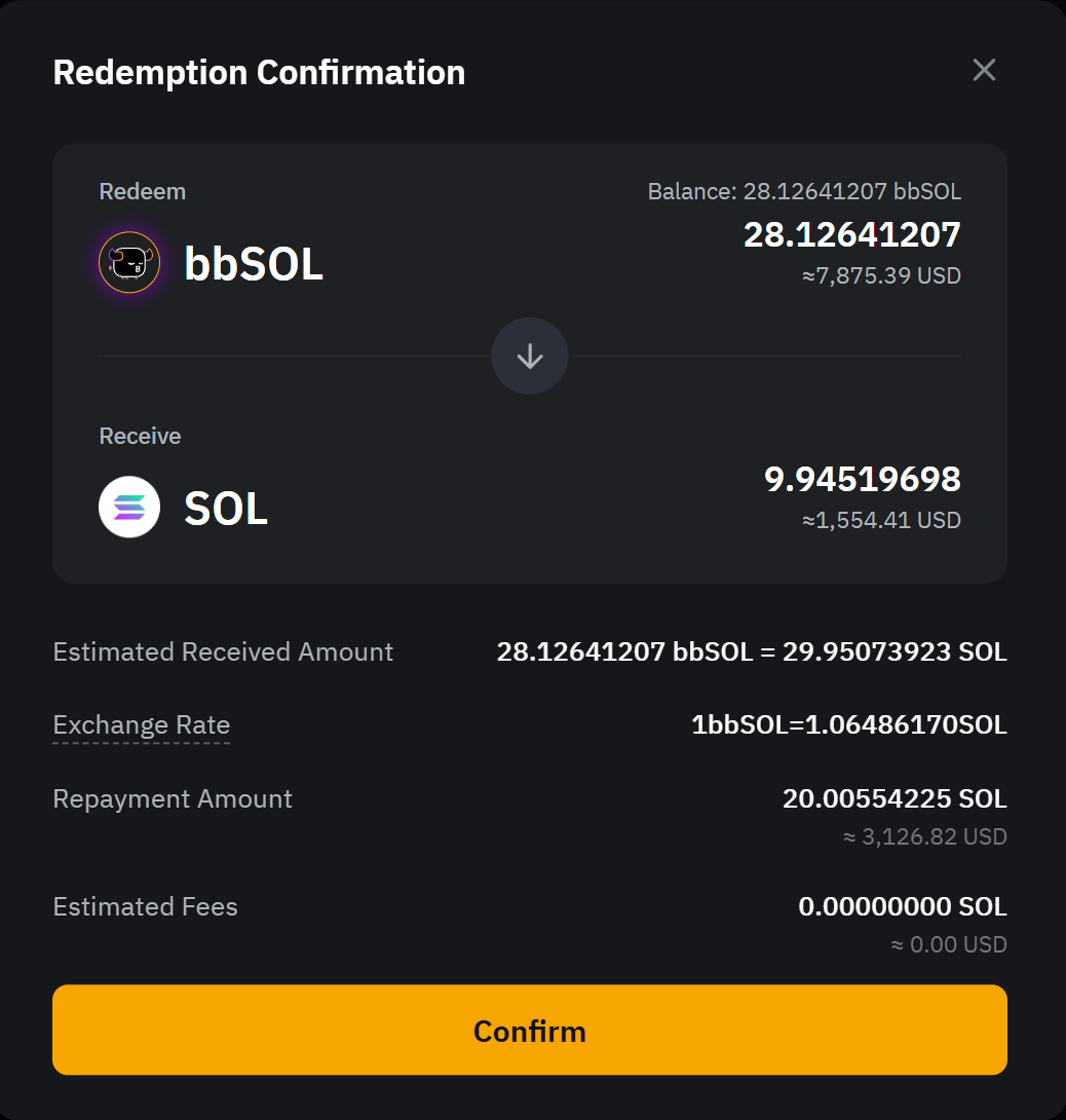 - Отложенное получение. Получите весь основной капитал и прибыль по истечении 1–4 дней периода обработки, в течение которого проценты будут продолжать начисляться. bbSOL будут конвертированы в SOL по текущему обменному курсу на момент отправки запроса на выкуп.