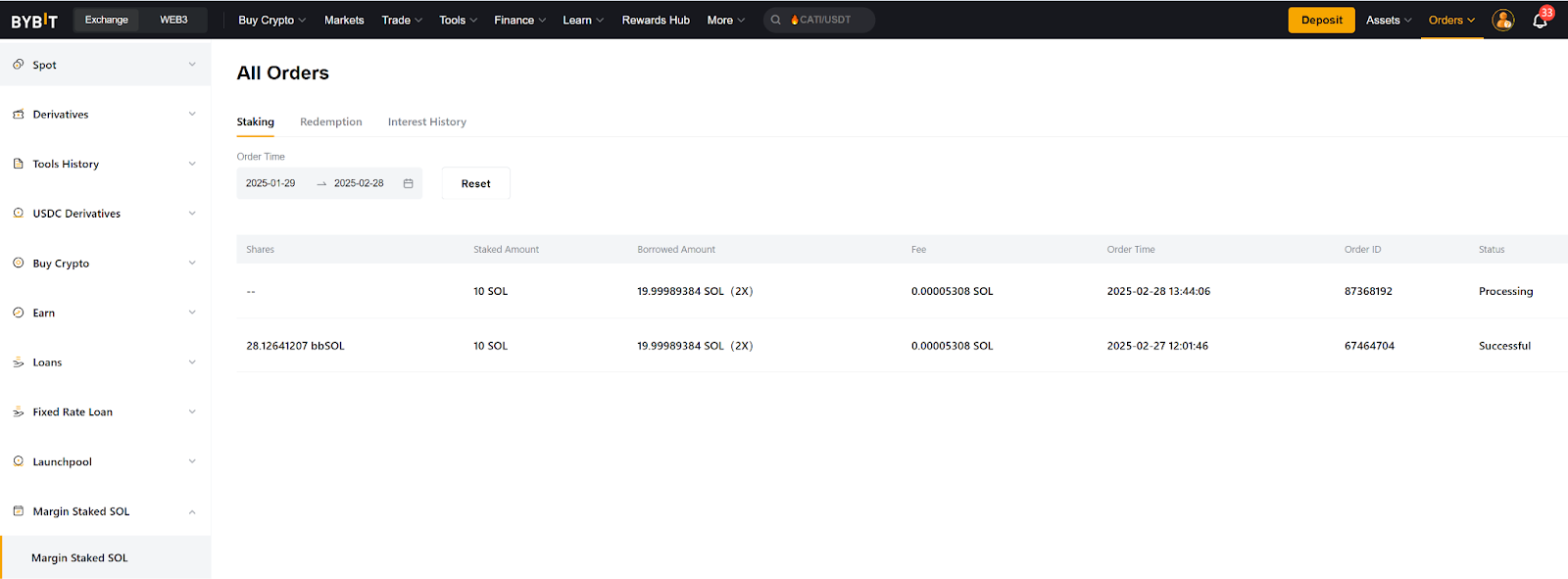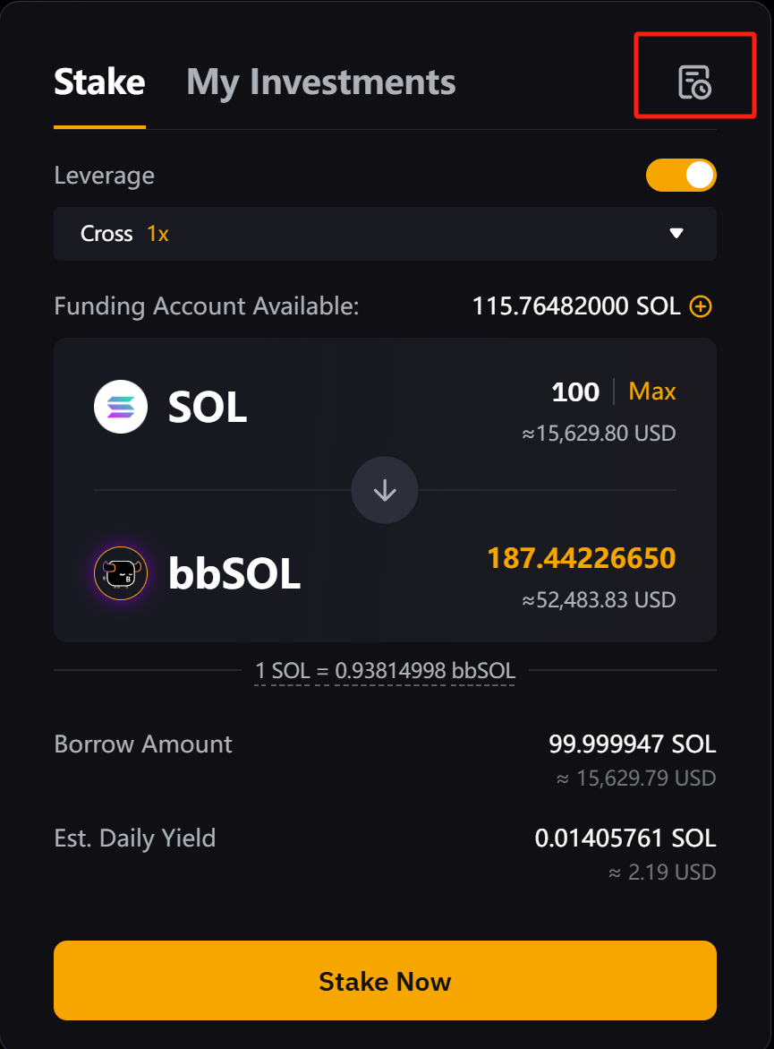 Шаг 1. Чтобы посмотреть ордера, нажмите на значок истории в правом верхнем углу панели Стейкинг или Мои инвестиции на главной странице маржинального стейкинга SOL.
