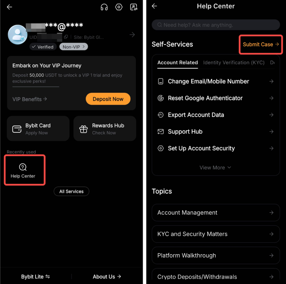 Шаг 1: Перейдите в Справочный центр Bybit и нажмите «Центр поддержки».