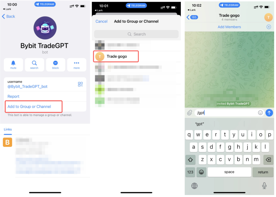 - Нажмите Добавить в группу или канал на странице информации Bybit TradeGPT.