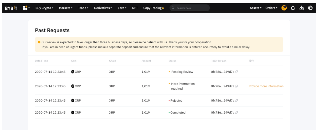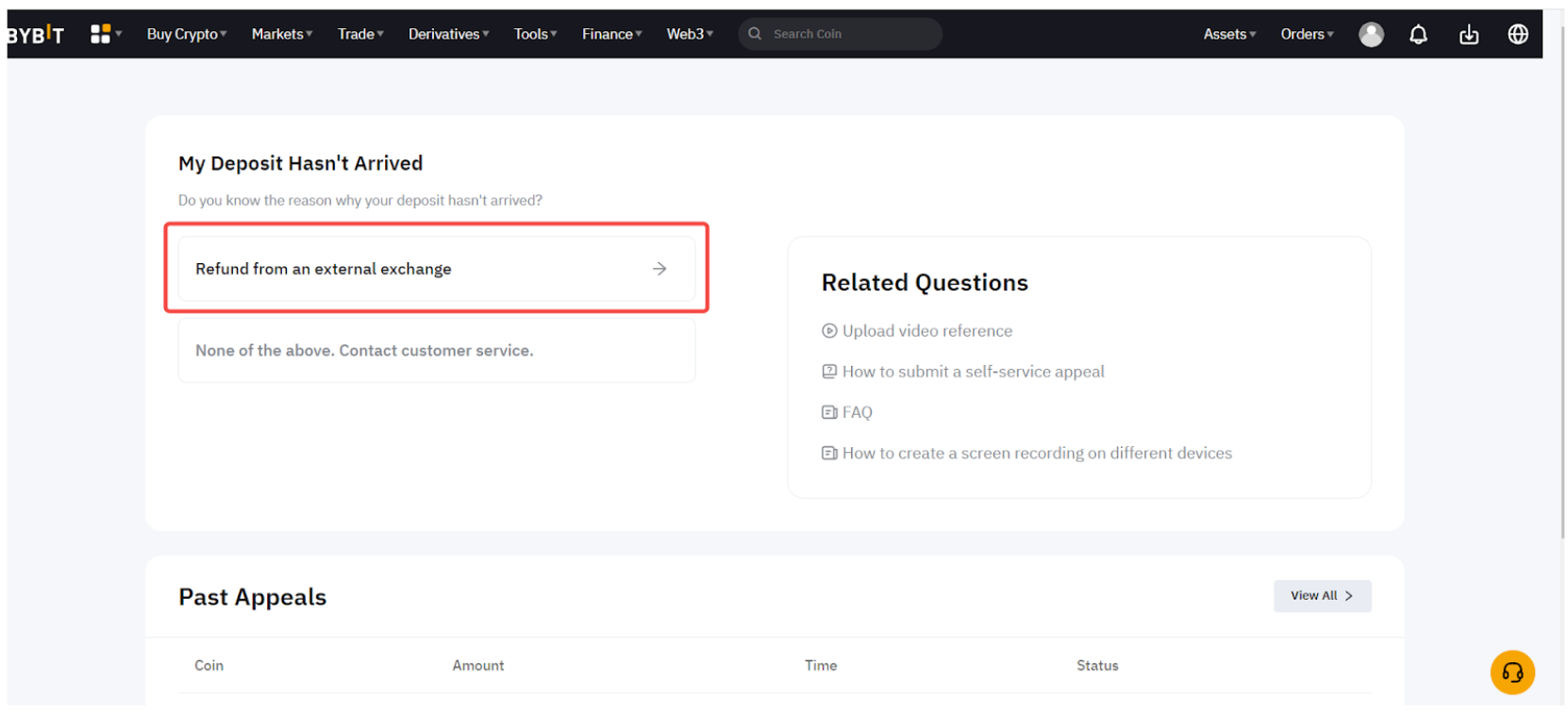 Как только вы подтвердите, что биржа-получатель вернула депозит на Bybit, получите всю информацию о возврате на соответствующей биржевой платформе. Затем следуйте рекомендациям ниже, чтобы подать заявку на возврат криптодепозита через раздел самообслуживания на Bybit.