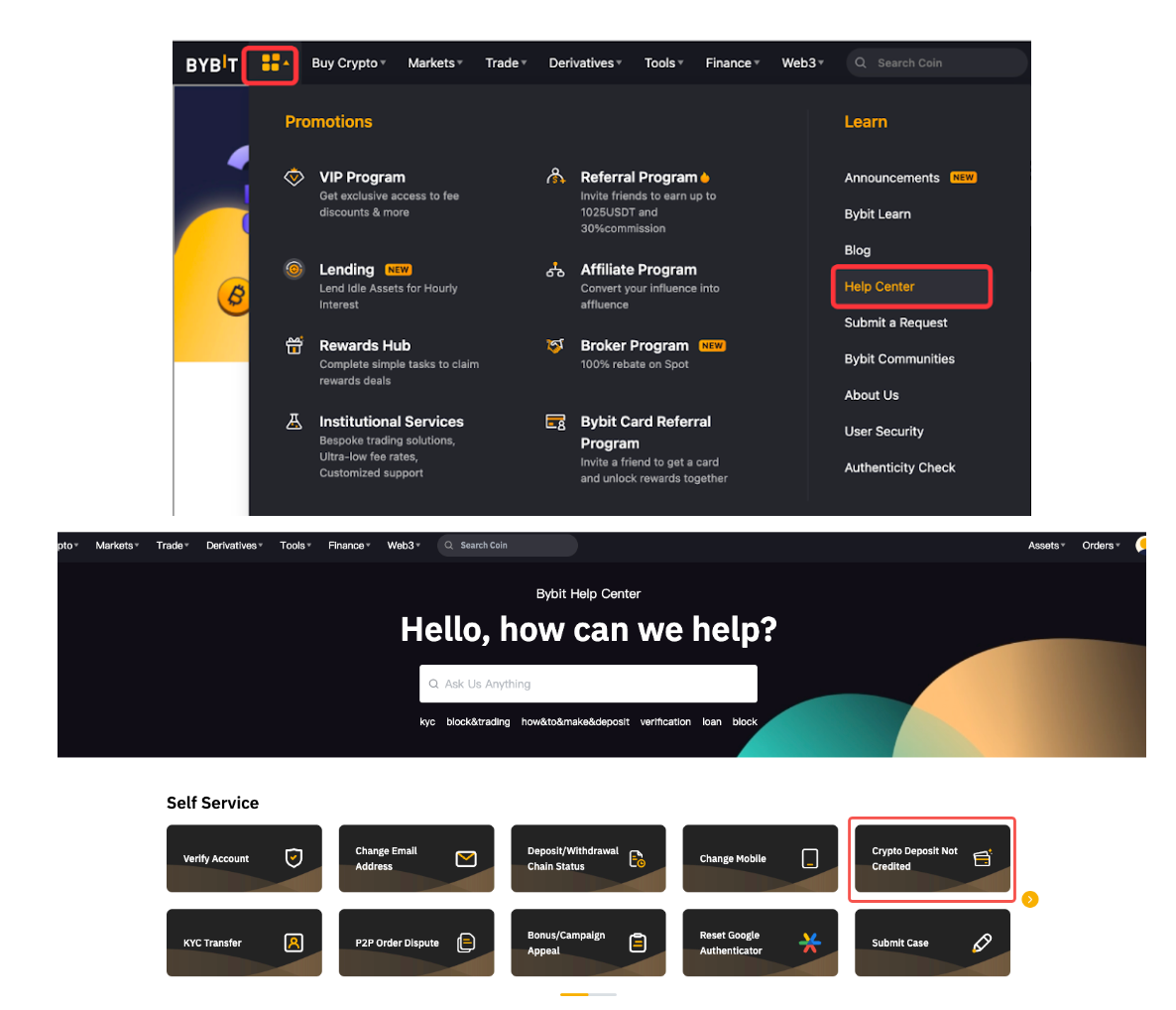 Шаг 1: Наведите курсор на верхний левый угол, чтобы найти Справочный центр → Выберите Мой депозит не поступил, и вы будете перенаправлены на страницу самообслуживания.