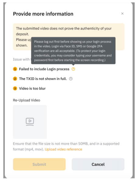 Загрузите новое видео в HD-качестве и убедитесь, что все детали (сумма, дата/время, TXID и т. д.) чётко видны.