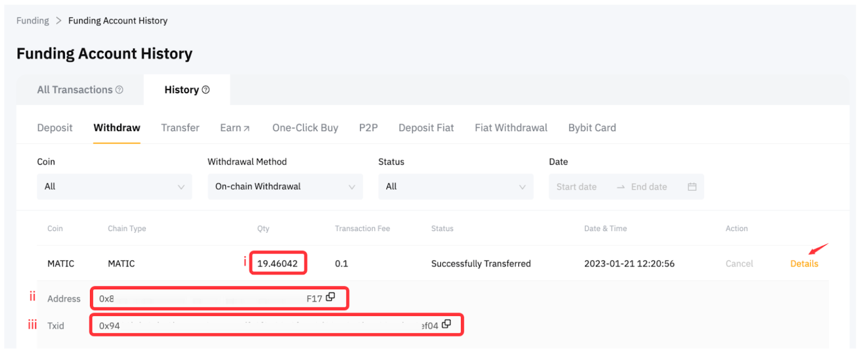 Если статус вывода средств на Bybit отображает «Успешно переведено», но вы не получили его на бирже-получателе, вы можете предоставить TXID вывода в службу поддержки клиентов этой биржи. Детали TXID вывода средств можно найти в Истории аккаунта финансированияВывести.