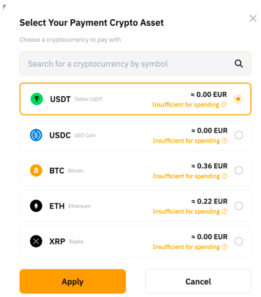 Натисніть Оплатити за, і вам буде запропоновано перейти до вікна управління. Потім ви можете (a) керувати ордером, перетягуючи його вгору та вниз, або (b) додавати та видаляти монети зі списку. Після завершення ви можете здійснити покупку за допомогою картки Bybit, і система дотримуватиметься встановленого вами пріоритету оплати.