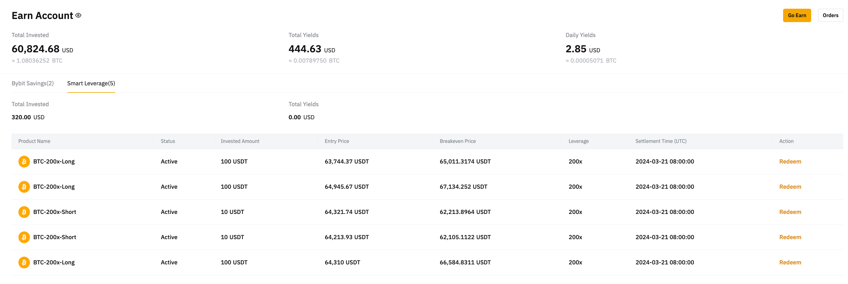 Крім того, ви можете натиснути Активи у верхньому правому куті сторінки Bybit, щоб перейти на сторінку Акаунт Earn. Тут ви можете переглянути наявні ордери.