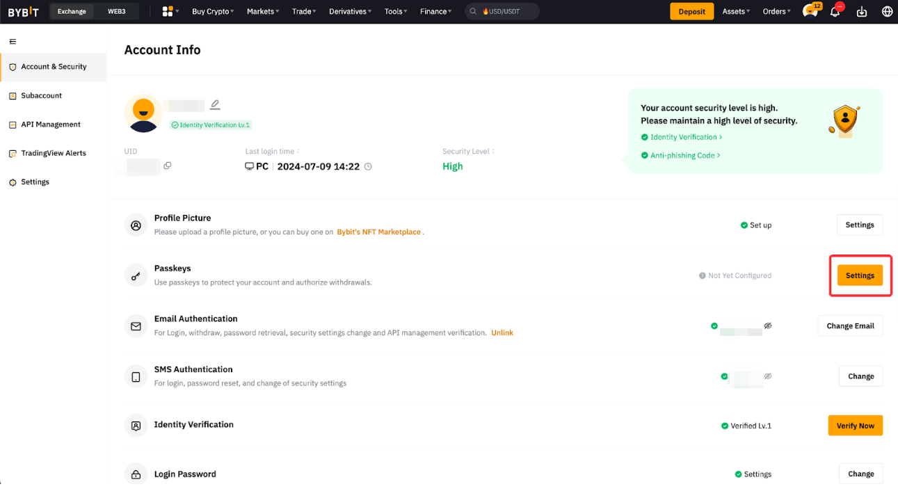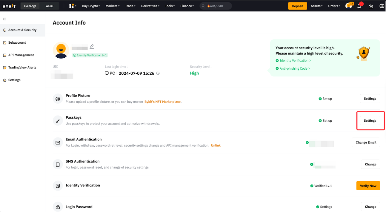 Bybit представила Passkey 2.0 — пасивний ключ Fast Identity Online (FIDO), який використовує біометричні дані, зареєстровані на вашому пристрої, для безпечної перевірки на різних пристроях. Passkey (ключ доступу) створює додатковий рівень захисту акаунта, що забезпечує швидші та безпечніші транзакції для вашого акаунта. Паскі – це новий, стійкий до фішингу та зручний для користувача спосіб автентифікації в Інтернеті. Замість пароля ваш пристрій генерує унікальну пару криптографічних ключів. Одна частина цієї пари ключів надійно зберігається на вашому пристрої, а інша зареєстрована на веб-сайті або в службі, на яку ви реєструєтеся. Це означає, що вам більше не потрібно пам’ятати складні паролі або хвилюватися про їх викрадення у разі витоку даних. Паспорти також додають додатковий рівень захисту облікових записів, забезпечуючи швидші та безпечніші транзакції для захисту вашого облікового запису.