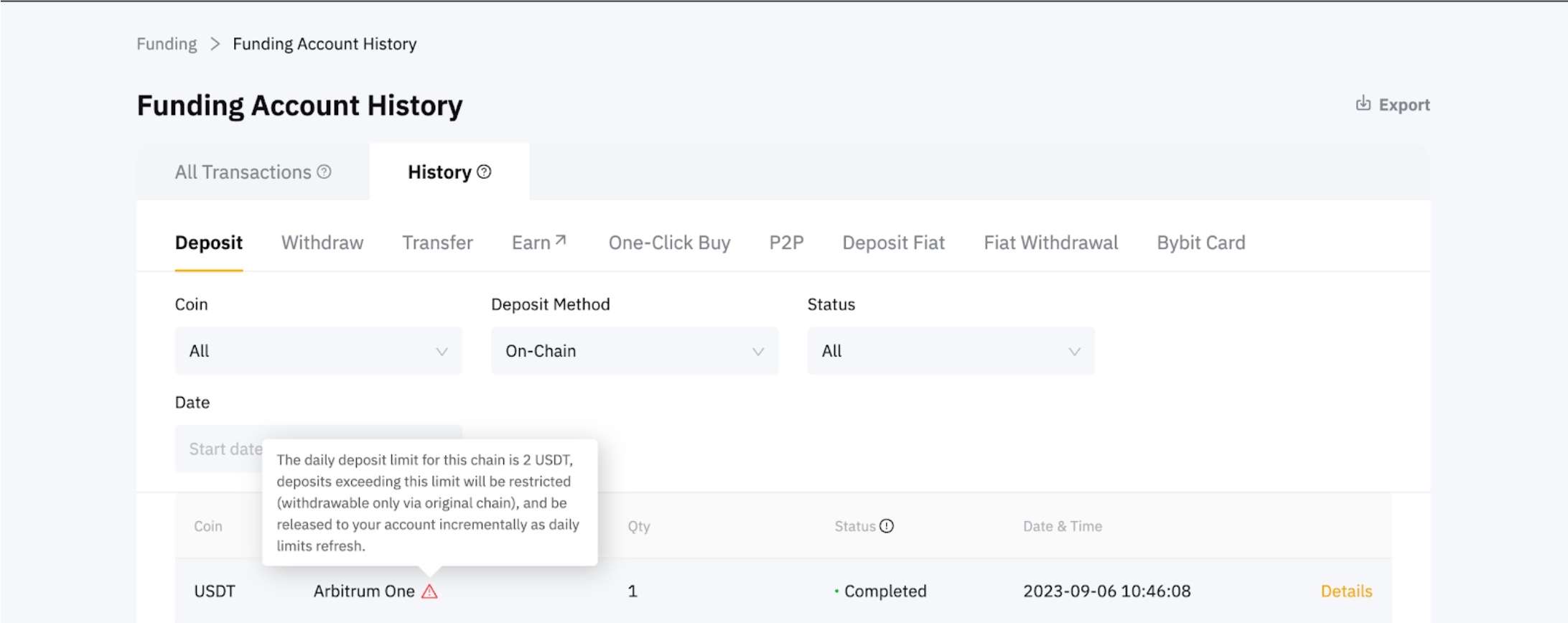Bybit đã thiết lập giới hạn tín dụng nạp tiền hàng ngày cho mỗi blockchain cụ thể. Các khoản tiền nạp vượt quá giới hạn này sẽ tạm thời vẫn là tài sản không thể giao dịch và có thể được xem trong phần Tài Sản Đang Chờ Xử Lý trên Trang Tài Khoản Funding.