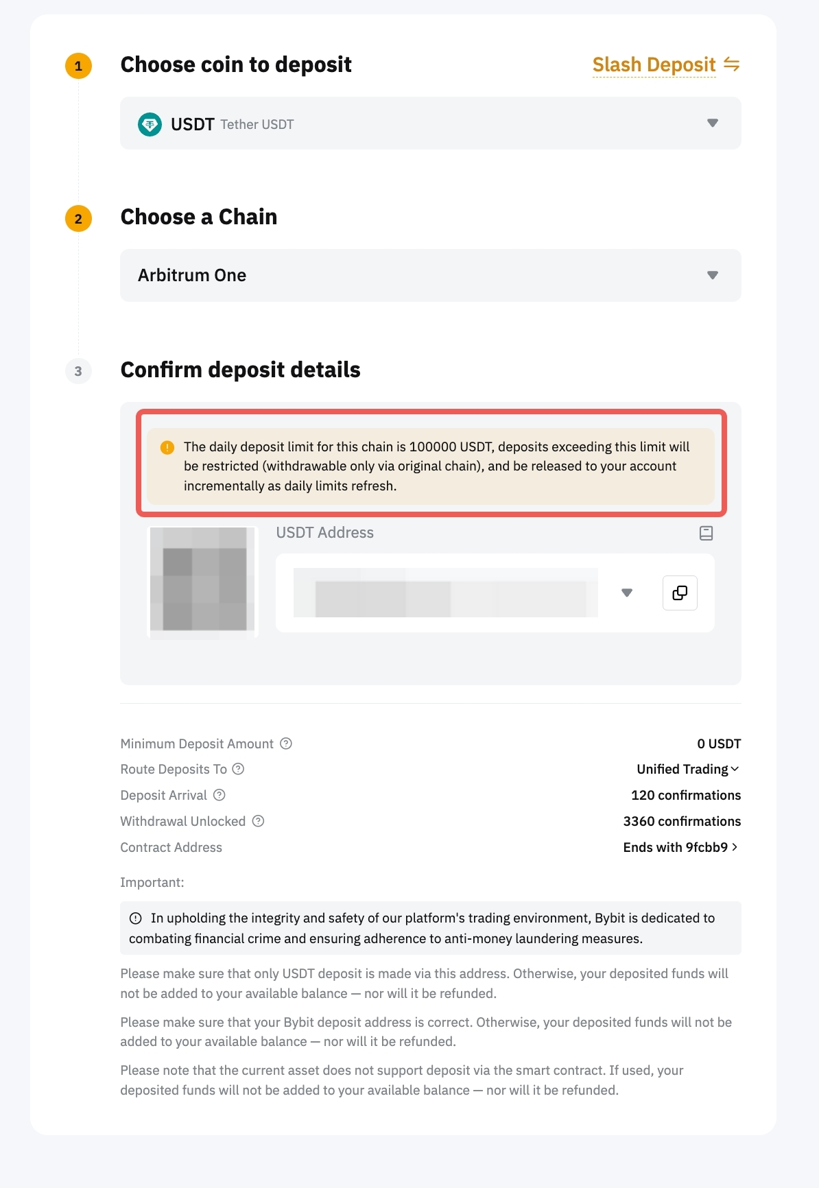 Tài sản tối đa có thể được chuyển mỗi ngày được giới hạn ở giới hạn nạp tiền hàng ngày. Ví dụ: giới hạn nạp tiền cho USDT qua Arbi Chain là 100.000 USDT và tổng tài sản đang chờ xử lý của bạn cho USDT là 300.000 USDT. Khoản tiền 300.000 USDT sẽ được chuyển vào tài khoản của bạn trong ba ngày, với 100.000 USDT được chuyển mỗi ngày.
